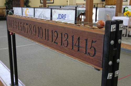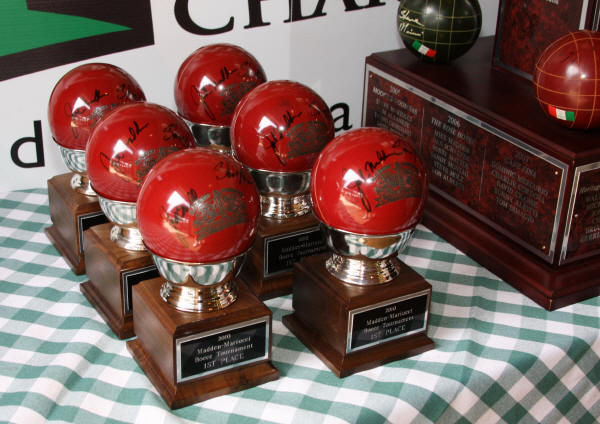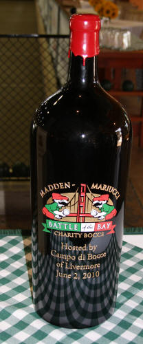 the Tournament Website This year the event was expanded from 32 to 40 teams. They were divided into 8 divisions of 5 teams which match the NFC division names (see scoreboard photo below). In the preliminary rounds, each team in a division played each of the other 4 teams. Since there are 8 courts, only 16 teams could play at once. This allowed a break between games for each team to eat, socialize, and eat some more. Games were to 10 points, or 25 minutes, whichever occurred first. At the end of 25 minutes, a frame in progress was completed. Ties were decided by a roll-off with a single ball per team. The closest to the pre-placed pallino won. At the end of the preliminary rounds, the top team from each division went on to the playoffs. Between rounds the silent auction was held with items including: a 12 liter bottle McGrail vineyards wine, a Celebrity Cruise, a case of Wood Family Madden Ranch Syrah, and a magnum of Lafite Rothschild Wine. The playoffs were single elimination. The 25 minute limit applied to the quarter and semi-finals, but waived for the final. The finals were to 12 points with no time limit. The finals were between the The Dogs of War and Mooch's Gumba's, with The Dogs of War victorious. John Madden's team (Ruby Hill Golf Club / Top Grade Construction) did not make the playoffs even after winning 2 of 4 in the preliminary rounds.