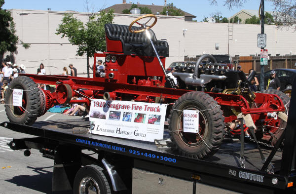 ![]() #141 - 1920 Seagrave Fire Truck Livermore Heritage Guild More of Livermore's past, this beauty is a 1920 Seagrave Fire Truck and is not yet completely restored, but obviously well on its way. This was the first commercially made fire truck ever purchased by the City of Livermore. It was purchased in 1920 for $10,750 and was used from 1920 to about 1960. It was acquired by the Livermore Heritage Guild in 1980 and restoration began in September 2008. The truck has a 6 cylinder, 1,012 cubic inch, 110 horsepower engine which drives a 800 gallon per minute water pump. Painting was donated by Tri-Valley Auto Body and transportation today is provided by Allen's Automotive Towing. Riding on the truck are many of the volunteers who are restoring it. The truck is stored at the Lincoln Highway Garage at North "L" St. and Portola Ave. |