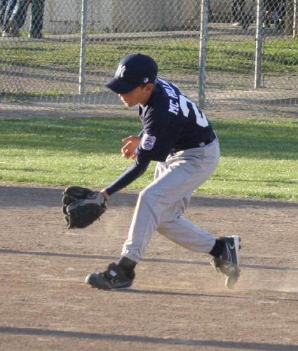 ![]() AJ catching a low fly ball. Sequence of three photos. The ball is in the glove already. (I can only aim the camera so fast) |