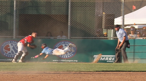 ...unfortunately he slid past the bag and was tagged out. |