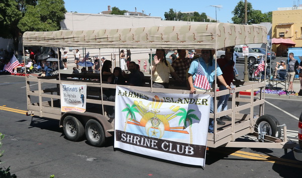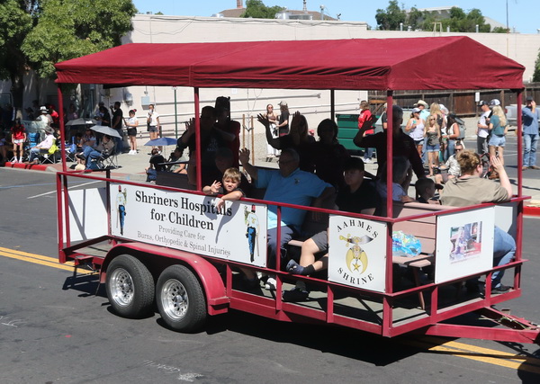 #38 - Aahmes Shriners-on-Parade 1st Place: Mounted Group (Senior) (A)Here is the Shrine Mounted Patrol The members of the Aahmes Shrine mounted patrol are riding matched Tobiano Paint Horses. Take special note of the silver saddles with green coronas. The mounted patrol has been riding in parades, rodeos, and charity events for many years. This includes: the Rose Parade in Pasadena, The Grand Nationals at the Cow Palace, and at President Jimmy Carter's Inaugural Parade. President of the mounted patrol this year is Tim Wilbur. The Riders are Tim Wilbur, Mark Campedell, Brian Ross, and Pat Quinn. Other members of the Mounted Patrol are walking with the riders. (B) Aahmes Shrine Elective Divan: (Dye Van) These are the elected leaders for