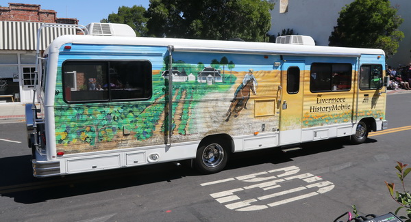 Livermore History Mobile The Livermore History Mobile promotes a unique sense of Livermore by educating residents and visitors about the history of our city. The murals display the established way of life of the Livermore Valley. Inside, docents talk about the beginnings of Livermore, even before it was a city, all the way up to the present day. The History Mobile visits third grades in all Livermore elementary schools and appears at local events such as the Farmer’s Market, Ravenswood Park, parades, festivals, and wine events. The goal is to educate the community and instill a sense of pride in our Livermore heritage. The driver of the History Mobile is Steve Azevedo with passenger Tom Eberly. |